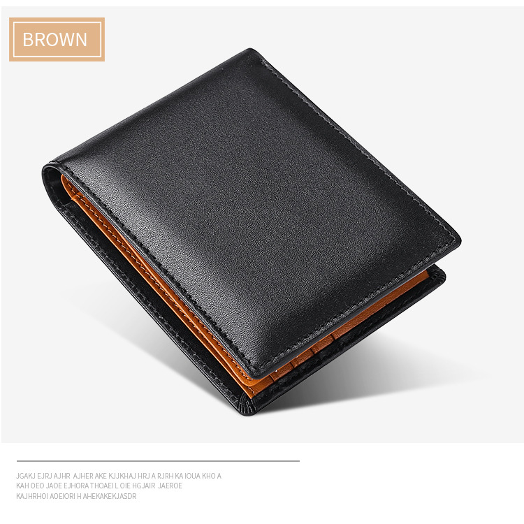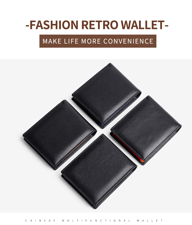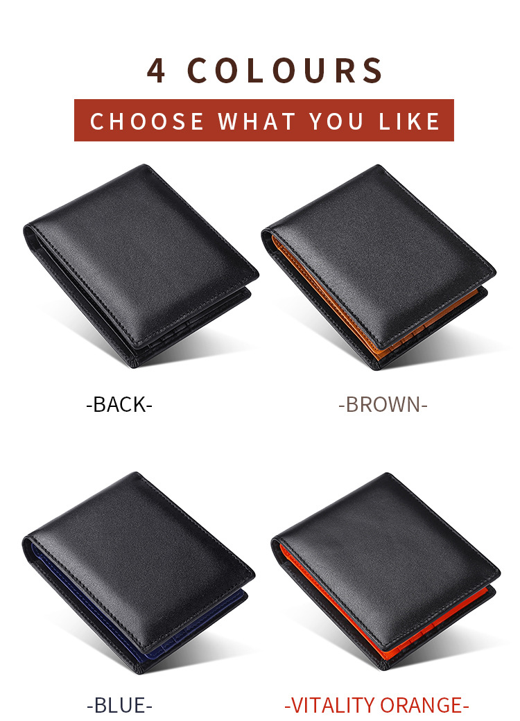 Colors: Brown leather wallet, Blue leather wallet, Orange leather wallet, Black leather wallet